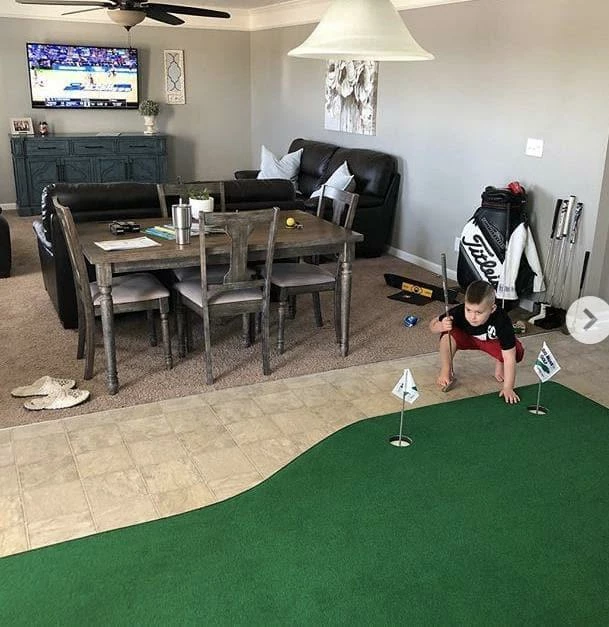 Perfect for large spaces, this green has 3 regulation cups configured on the edges and a 3″ reduced hole in the center for accuracy practice!