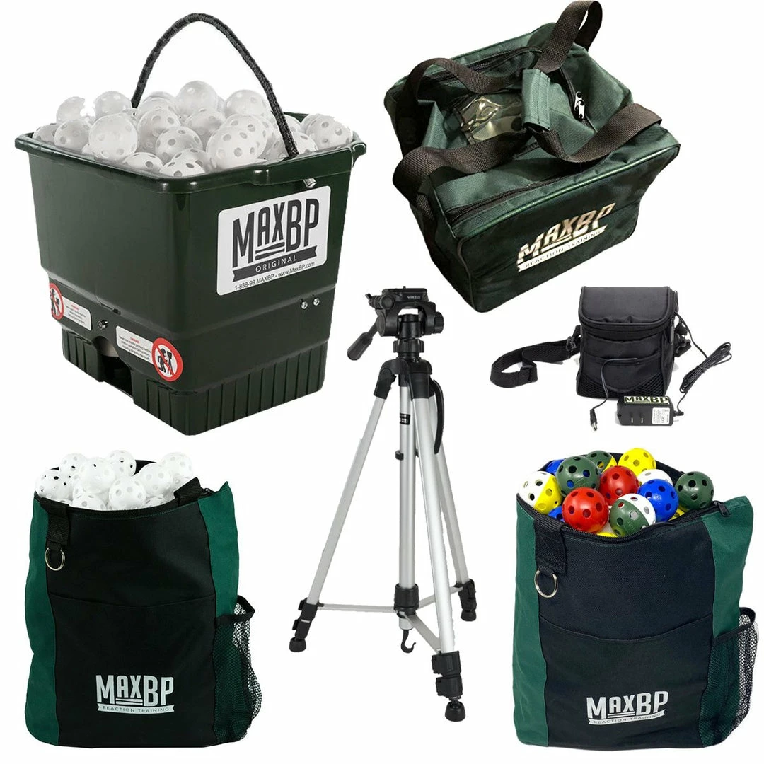 Included in this package are the MaxBP Original Machine, Portable Battery Pack, Tripod, 96 Mixed-Color golf ball sized wiffle balls, 2 Ball Bags, and a Machine Bag.