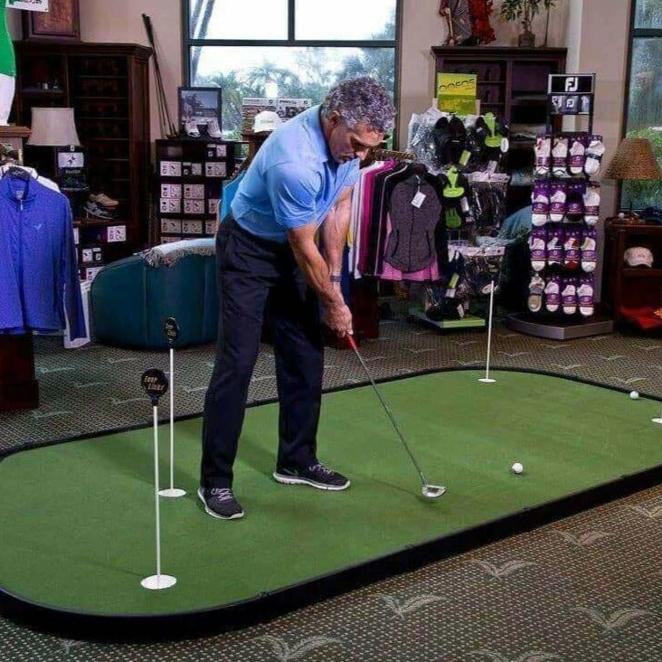 Never before could everyone own their own putting green for such an affordable price. Twelve feet long and six feet wide, this green will add charm to any indoor living space. This professional quality green has adjustable breaks and four regulation cups and pins. Molded from high-impact polymers, the patented design makes installation a snap. Locate the perfect spot in your home and get ready to enjoy putting on your own private green! Plenty of room for several golfers. There is only one way to improve – practice, and there is only one way to practice – Tour Links!