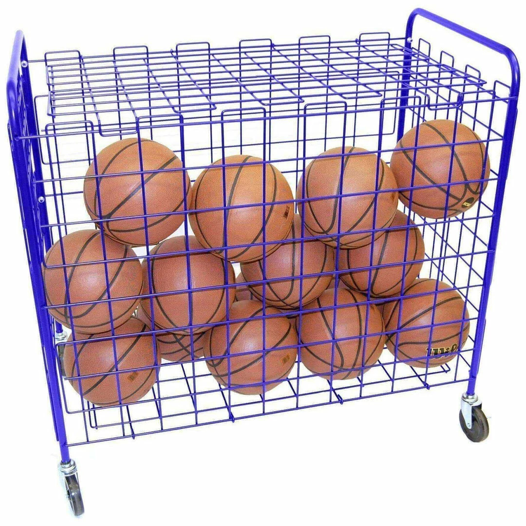 Full size locker holds 28-30 balls. Heavy steel wire mesh. Powder-coated for durability. Hinged lid can be locked. 4 HD swivel caster wheels. Powder coated blue.Β